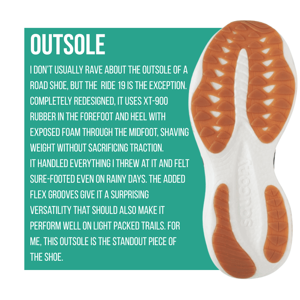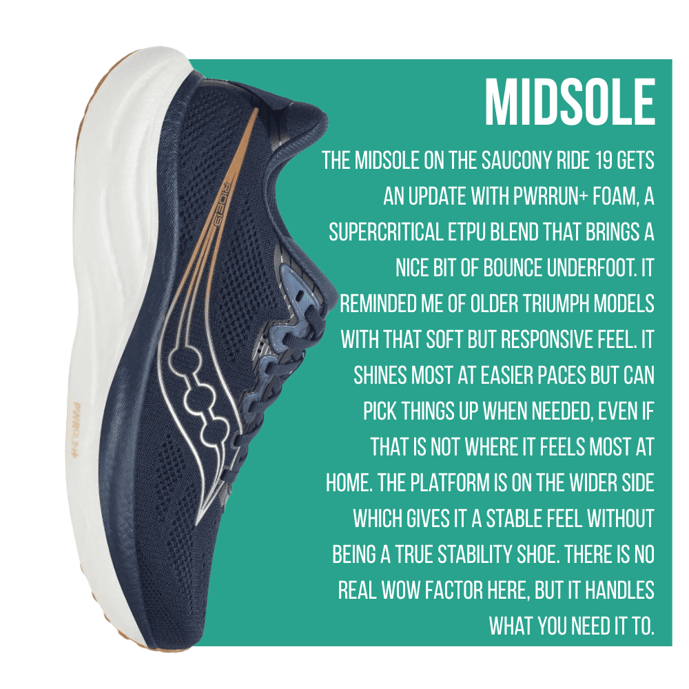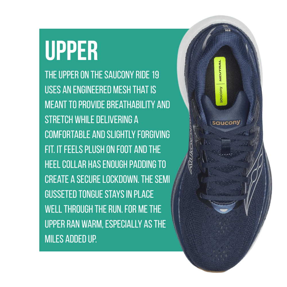 The Saucony Ride 19 is available at Run N Tri Mobile. Aaron and staff provide a premier fitting process that includes proper measurement of the length and width of your feet, arch, and leg axis. A gait analysis is performed to identify pronation or lack thereof and pressure points.